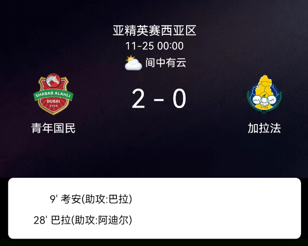 北京时间11月25日,亚足联冠军精英联赛联赛阶段第5轮,迪拜青年国民主场迎战加拉法体育。第9分钟考安-桑托斯破门,1-0;第28分钟吉列尔梅-巴拉破门,2-0;迪拜青年国民1张黄牌,加拉法体育2张黄牌。最终比分,迪拜青年国民2-0加拉法体育。